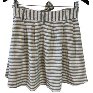 Elevate your summer wardrobe with this charming striped skirt from Francesca's Blue Rain collection. Featuring a flattering high-waisted design with a tie belt, this skirt boasts a stylish button-front detail and pleated construction. The classic gray and white stripe pattern offers versatility for various occasions. Perfect for casual outings, beach days, or dressed up for a brunch date. The lightweight cotton fabric ensures comfort and breathability, making it an ideal choice for warm weather.