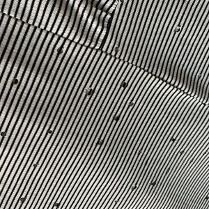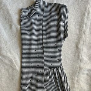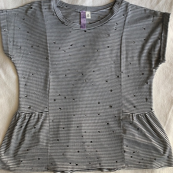 Distressed with black and white stripes, this top also has great stretch and a flattering peplum. Lightly worn.