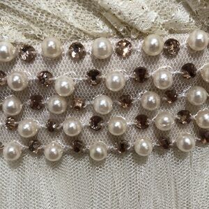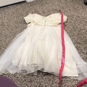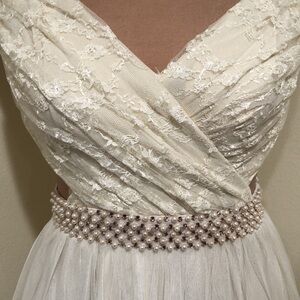 Excellent condition no stains rips or fading. Sleeveless, sweetheart neckline, padded bust (no wires or boning), fit and flare silhouette mini dress with cutout sides. Cream with shimmery floral lace, cream pearls, and rose gold pink rhinestone crystals. No size tag but fits like XS.