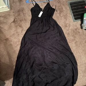 Chic black maxi dress with floral texture. Spaghetti straps and open back design. Perfect for elegant outings.