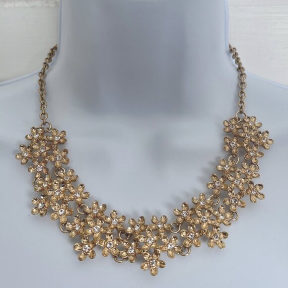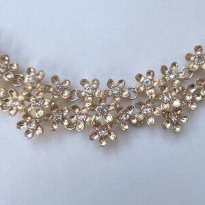 Gold and rhinestone floral jewelry set by Francesca's Collections. Includes earrings and statement necklace that is 18" in length with a 2.5" extender. This set is perfect for your next spring or summer event, like prom, formal, wedding guest, or fun night out. I wore this set once to a wedding, it's in excellent preloved condition and comes from a smoke and pet free home.