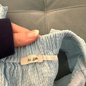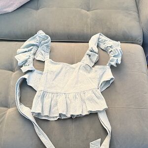 Charming light blue blouse with ruffled sleeves. Features a flattering fit and stylish design. Ideal for casual outings.