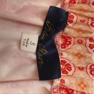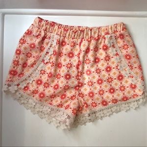NWT: Bought at Francesca's Collections. Orange patterned shorts with elastic waistband and Lace embellishment