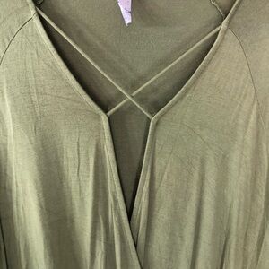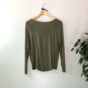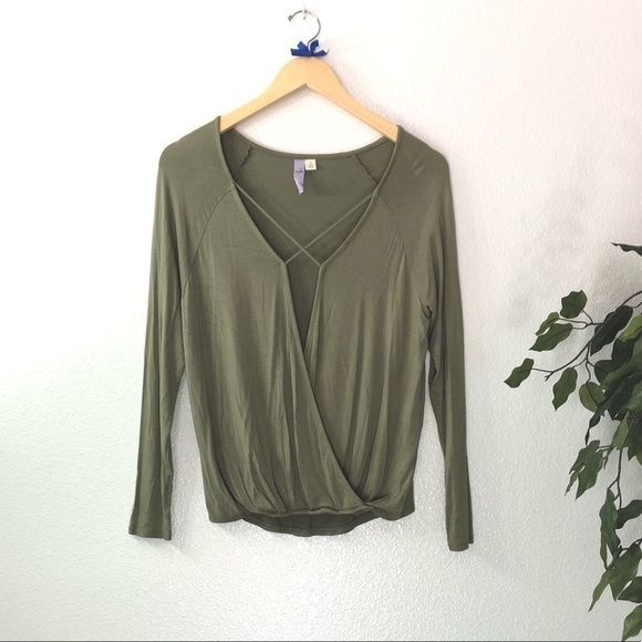 An incredibly soft long sleeve top with a slightly longer back and criss cross front detail. A little bit of elastic in the front to make it looked tucked in when you wear it with jeans. Small slits on the sides. Light weight and comfy