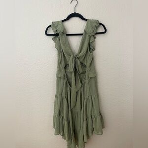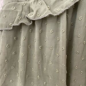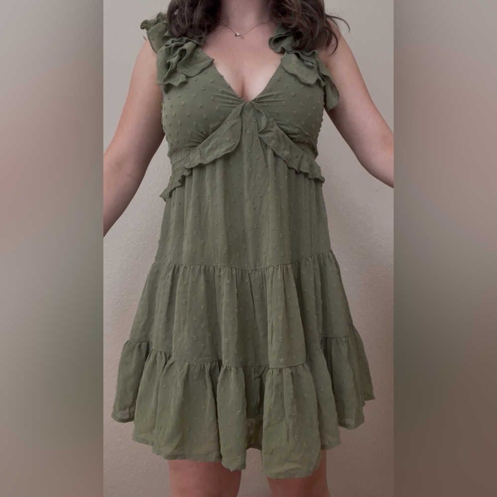 This elegant olive green dress features charming ruffles, an adjustable back tie and a textured design, perfect for any occasion. Its soft fabric and flattering fit make it a must-have addition to your wardrobe. BRAND NEW, never worn!