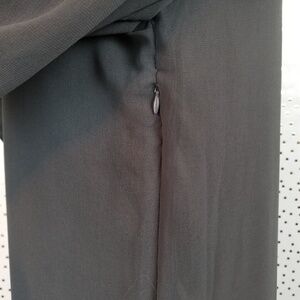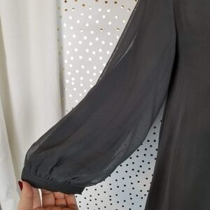 Francesca's dark gray dress. Buttons down the front with ruffles along the sides. Three-quarter length sleeves. Zipper down the left side. Sheer overlay. Size Small. 100% Polyester.