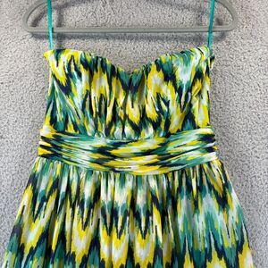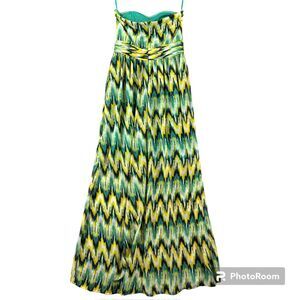 • Style: Strapless Maxi Dress Ruched Waist Front Slit Lined Chevron Stripe Yellow Green Blue Beachy Coastal Vacation Summer