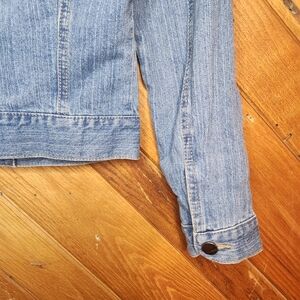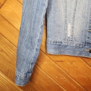 Francesca's Harper distressed lace detailed light wash denim jacket size small. 2 real pockets in the front. 87% cotton, 8% Rayon, 5% polyester. style 30307. Excellent condition and so cute! smoke free home.