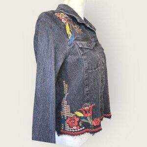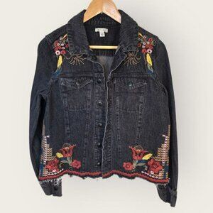 Francesca's Jean/Denim Jacket Sz S Mi ami Floral Embroidered Embellished Spring