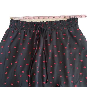 Features: Francesca's Jun & Ivy Black and Red Heart and Lips Kiss Print Mini Skirt; pull on style, stretchy elastic waistband with self ties, flare.