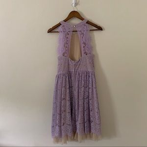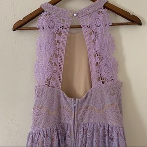 Francesca’s lavender lace dress in size M. Neutral colored fabric underneath lace.