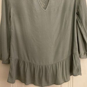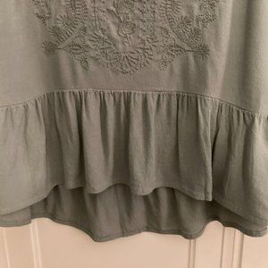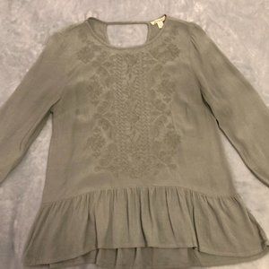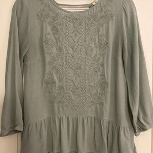 Francesca's Light Blue Embroidered Blouse in Size Small, back has cute cutout, ruffle hem