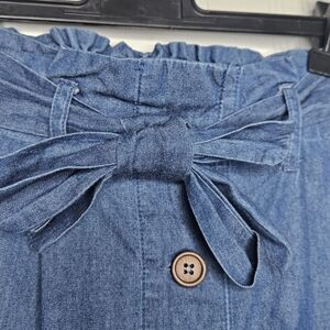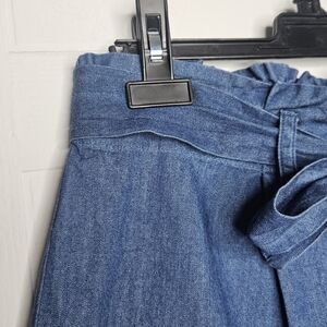 Lightweight denim belted mini skirt, button front. Ruffled elasticated waist.