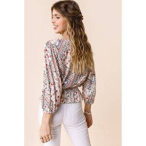 Francesca's Mi Ami Catelyn White Red Lace Up Tile Print Blouse