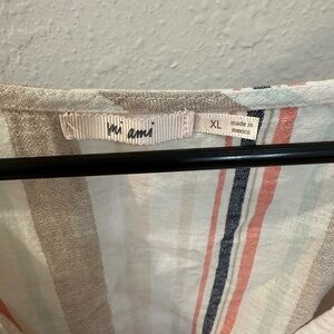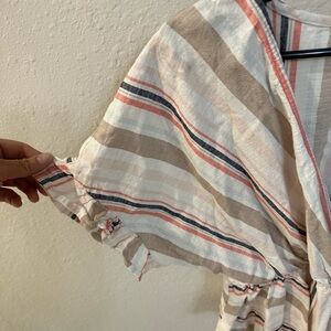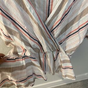 Francesca’s Mi Ami Peplum Striped Top. Top has cinched waist to accentuate your curves. Ruffled detail on ends of arms. Only worn once. Great condition. Pet free and smoke free home.