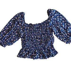 Womens Floral Navy Smocked Cropped Top. It can be worn on the shoulders or off.