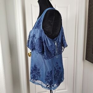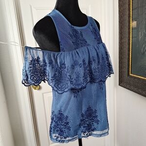 Francesca's Mi ami Sleeveless Cold Shoulder Frilly Lacy Indigo Top Medium