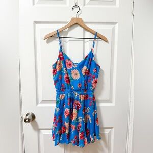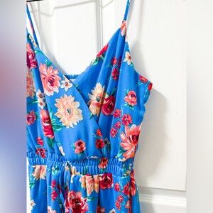 Francesca’s Miami blue colorful bright pink floral flirty romper wrap dress cute