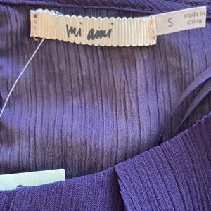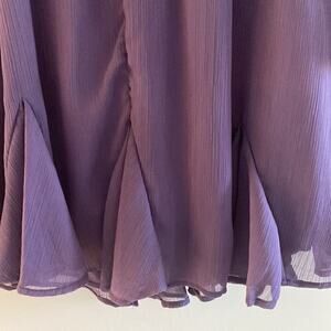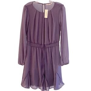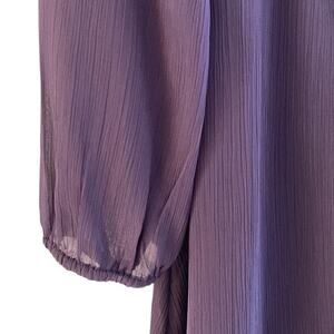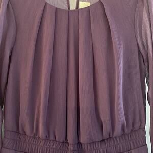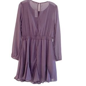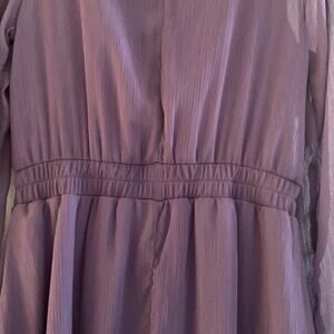 Dusty purple long sleeve dress by Mi Ami from Francesca’s. Pleated top. Scoop neck. Kehole in back with one button. See pictures of hem it's really beautiful with little ruffle inserts. Elastic waist with tie. Lined. Long sheer sleeves with elastic at wrist. New. Adorable Small