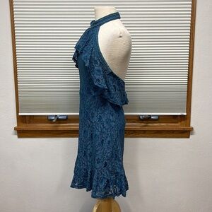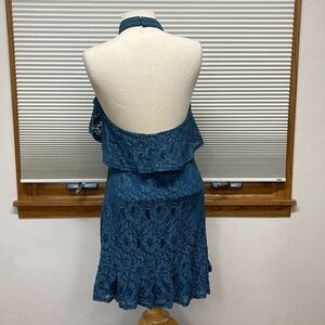 Francesca's Teal Blue Lace Halter Backless Mini Dress with Ruffle detail. Has a side zipper closure and buttons at back of neck. Lined