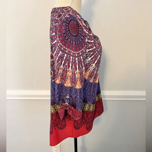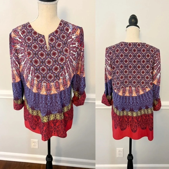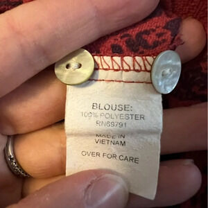 Excellent condition Slight v-neck, rolled sleeves that can button 3/4 length sleeves 100% Polyester