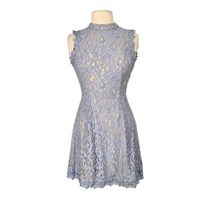 Francesca's A-line tea length dress in beautiful, feminine periwinkle blue lace, with high neckline and open back, adding the perfect combination of both sophistication and a flirty look. Very good pre-owned condition.