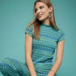 New with tags Francesca's Ramona jacquard printed knit top in size XS. This top features a jacquard print, turtleneck, and short sleeves.
