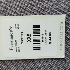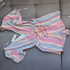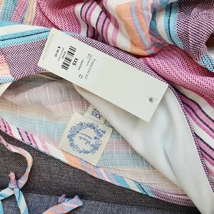 Francesca's Blue Rain rompers in size XXS. Stripes in blue, pink, orange, and white. Never worn, new.