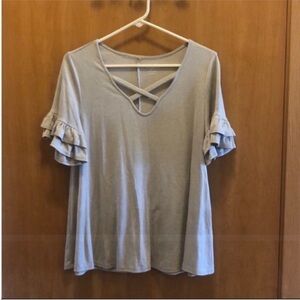 Item does show a small portion of the sleeve that was repaired, not noticeable while the top is being worn.