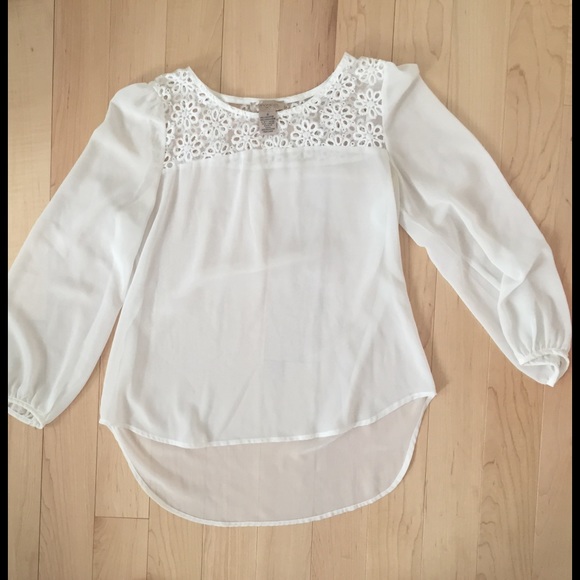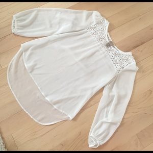 Sheer, white, cute lace embroidery at the top, cuffed sleeves, loose