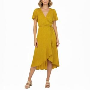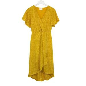 Francesca's Sienna Sky Yellow Polka Dot Short Sleeve Maxi Dress. Chiffon Wrap Front Style A-Line Dress with Ribbon Belt. Casual or Semi Formal Dress, Perfect for Spring or Summer! Cute, Pretty Modest Sun Dress
