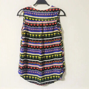 Francesca’s | Sleeveless Printed Blouse. V-Neck low button down Strip and zig zag sheer top. 42" from armpit to armpit. 28.5" long.