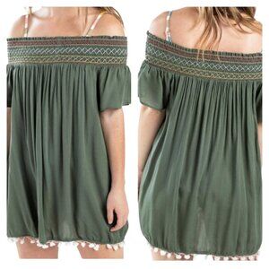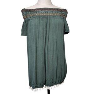 Francesca's Swim cover up or peasant top. Off-shoulder. Hunter green with multi-color embroidery, smocking and white pom-poms at hem. Short flutter sleeves. Pre-owned in excellent condition.