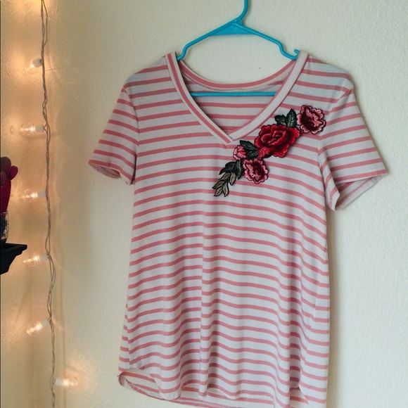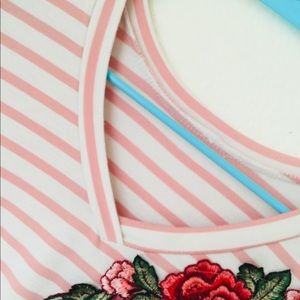 This is a pink and white striped shirt with a floral detailing at the top! It is in okay condition
