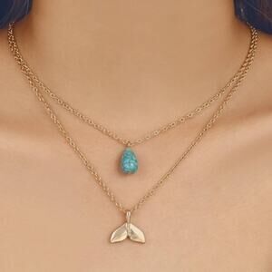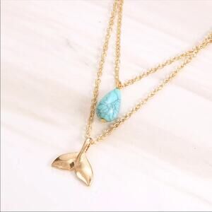 Francesca's Gold Necklace with Whale Fin and Teardrop Turquoise Stone. 2 Tier Multilayer Gold Chain Necklace
