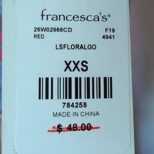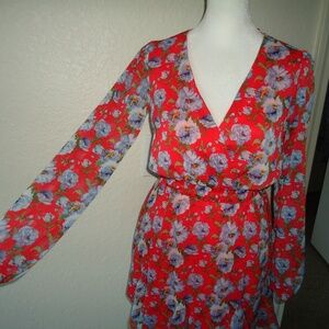 Francesca's Women's Red Floral Long Sleeve Wrap Dress Cocktail Blue Flowers Waist Tie Light Size-XXS