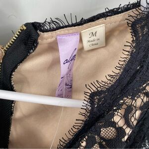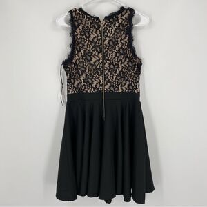 Top is lined lace. Skirt part is solid black. Sleeveless. Zipper closing on the back.