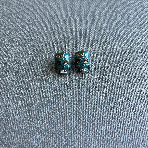 Francesca’s Day of the Dead skull stud earrings. Teal and has great details.
