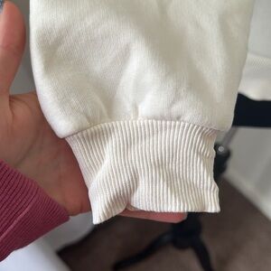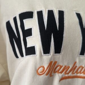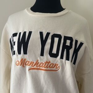 This is a cream color, crewneck sweatshirt. It is very soft on the inside. It says New York in dark letters and says Manhattan underneath it in an orange color it is slightly longer. In length. It is a size small. It has lightly been worn with no flaws.