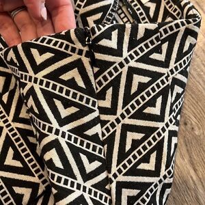 This skirt is is made Alya purchase at Francesca’s. It’s a black and white triangle print flirty skirt. This has a a hidden side zipper and the length is 17” and the waist is apx 15.5” laying flat. This is tagged a size large. my items come from a smoke and pet free home