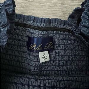 Francesca’s Blue Rain Ellison Chambray Smocked Wide Leg Denim Jumpsuit size S