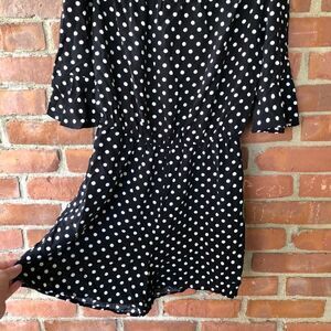 Blue rain Off the shoulder romper. Size medium. New with tags. Black with white polka dots. Underarm measurement is 20” across. Elastic waist is 12” across. Inseam is 2.5”. Bell sleeves.
