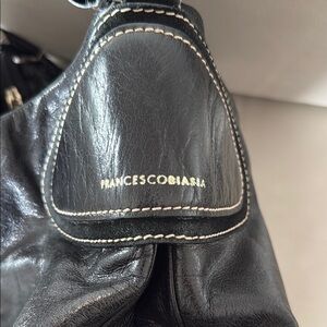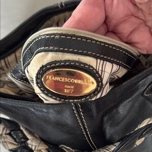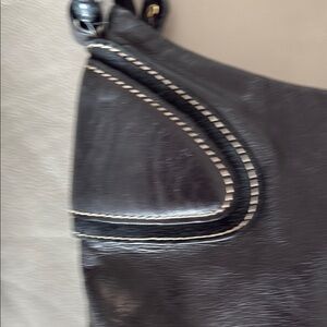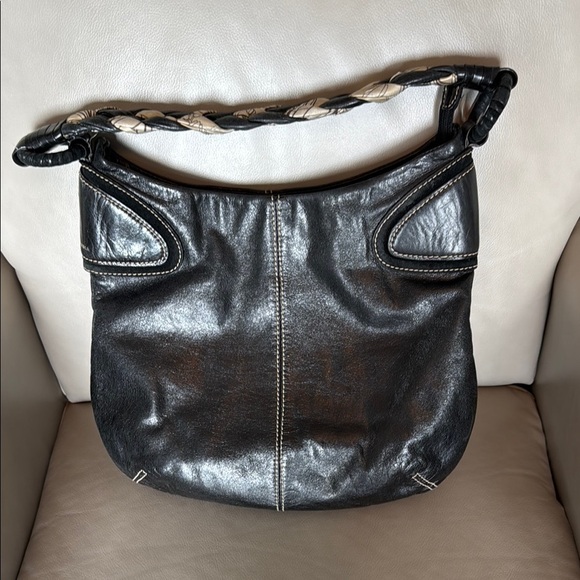 Elegant black leather women's bag with a stylish braided handle. Perfect for any occasion. Bag is absolutely gorgeous. There is somewhere on the fabric part of the leather strap in the braid very minor. Inside is a little dirty. I’m sure it could be cleaned. Otherwise bag is an excellent condition.