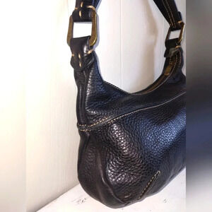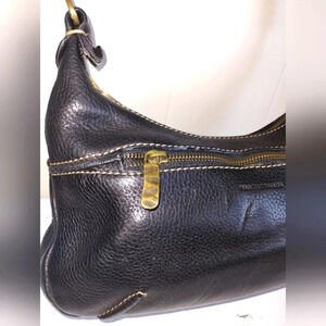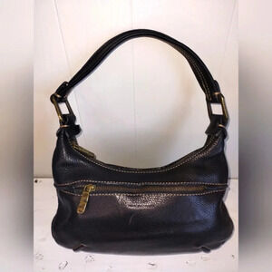 Discover the exquisite Francesco Biasia Pebbled Leather Handbag in sleek black, boasting a medium size of 8" x 11" crafted from soft pebbled leather. The heavy brass details add a touch of sophistication, complemented by the 9" shoulder strap drop for added convenience and style.