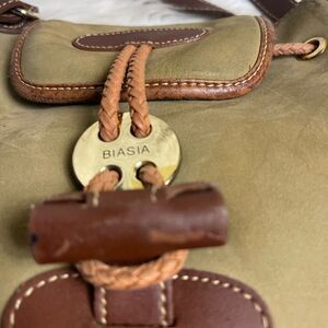 Francesco Biasia leather olive green and brown straps bucket drawstring bag flop top with loop closure. The inside lining has a side zipper. Pre owned in good used condition signs of wear on the leather. See all pictures any questions please message.Z1
