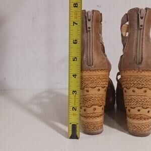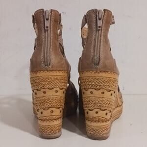 Francesco Morichetti Tan Wedge ankle wrap sandals back zip sz 40