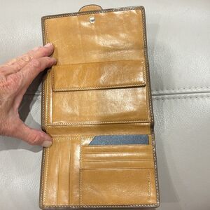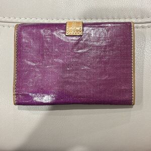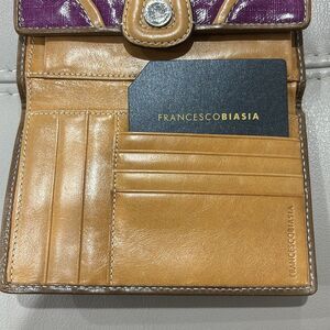 This Fracesco Biasia wallet showcases a bold purple body complemented by tan leather accents, creating a striking retro aesthetic. Its tri-fold design with a flap closure offers both style and practicality, making it a standout accessory for any occasion.