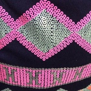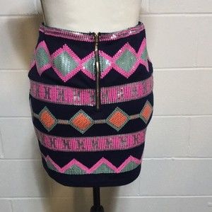 Navy blue sequin design lined mini skirt by Francesc"s. Size Sm. New with tags. Waist measures 26" - Hips 34" and 15" long. Has a back zipper. 95% polyester - 5% spandex. Lining 100% polyester. Retails for $44.00. Comes from a smoke free home.