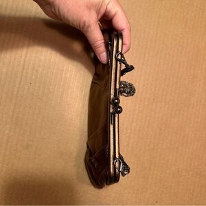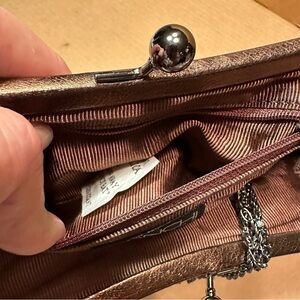 Gorgeous bronze/dark gold metallic leather Franchi Collection convertible clutch/handbag. Removable chain strap. Snap lock closure, inner zip pocket. Perfect for an evening out, a wedding, or any event!