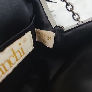 Beautiful evening handbag by franchi covered in spiked paillette sequins with a satin lining, chain accent for easy carry, and a kisslock closure of crystal embellished roses. Great pre-owned condition with little signs of use.